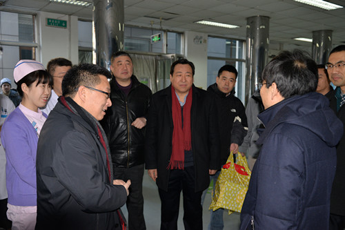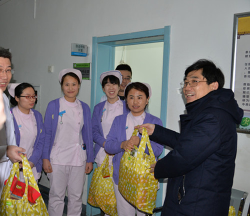 1月27日农历大年三十上午,大学校长徐安龙在党校办副主任张礼财的陪同下来医院看望慰问了春节期间值班的全体医务人员,并送来了慰问品及新年的祝福。我院党委书记杨晋翔、院长刘金民、副院长赵海滨、纪委书记裴晓华等机关处室相关负责人一同参加了慰问。徐安龙校长到急诊看望慰问值班人员。向值班人员表示亲切问候,向大家拜个早年,并叮嘱要搞好春节值班工作,忠于职守,以自己的辛勤劳动确保患者过一个欢乐祥和的春节。徐安龙校长在慰问中指出,三附院职工2016年在院领导班子的带领下,同心协力,在医、教、研等各项工作中取得了长足的进步,代表大学党委表示感谢!并希望三附院全体职工在2017年度再接再厉,以优异的成绩迎接党的“十九大”的胜利召开。值班单位工作人员纷纷表示,将不负领导厚望,尽职尽责,出色做好各项工作。