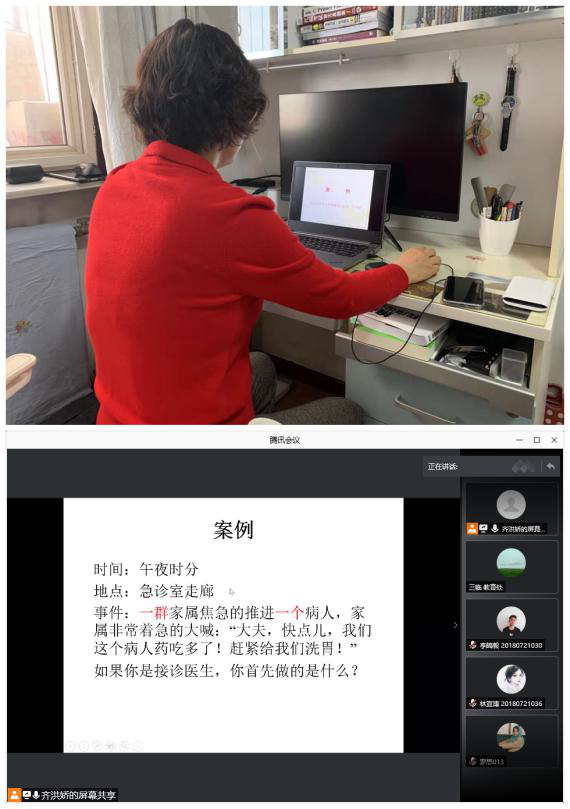 我院授课对象是境外未返校学生,需进行长期线上理论授课。通过上一学年线上教学的经验积累,各教研室在工作中更加得心应手,迅速组建线上授课群,做好授课准备。3月1日,新学期第一天,线上理论课顺利开讲,老师们精神饱满,课程内容丰富。虽然师生间隔着屏幕,但也挡不住活跃的课堂气氛。