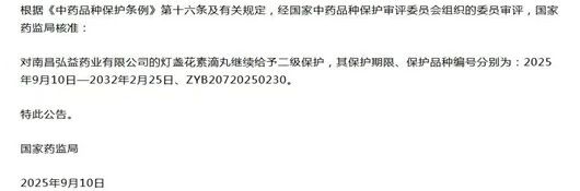 据国家药监局《关于中药保护品种的公告(延长保护期第24号)》:“对南昌弘益药业有限公司的灯盏花素滴丸继续给予二级保护。”