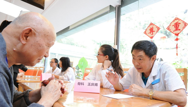 实践基地挂牌活动后,王庆甫副院长,教育处副处长赵永烈、内分泌科高晶副主任医师和老年病范红梅副主任医师开始给老人们进行义诊活动。在简易搭建的就诊台前,老人们在护工的帮助下排起了长队,等待专家们为他们检查身体,指导用药和养生保健方法。老人们积极的询问自己的健康问题,专家们耐心的讲解,交流过程十分和谐、愉快。短短两个小时的时间很快过去,考虑到老人们身体较差,需要休息,就结束了我们的义诊活动。老人们对我们恋恋不舍,不断地询问我们什么时候再来。其中一位奶奶还把她写的字送给我们以表示感谢。那副字写了一首诗,题目是欢乐颂,我们也希望老人们天天开心快乐。