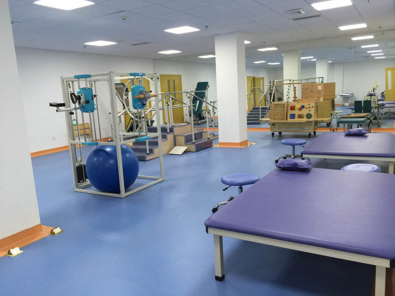 诊疗设备齐全:①基础康复设备:PT床、Bobath治疗床、PT凳、平行杠、组合训练架、内外翻足矫正板、站立架、PT多用组合箱、三向阶梯、训练球、哑铃车、作业综合训练车、作业疗法桌、手指机能训练桌、手指分离板、电子握力计、形体训练镜等;②先进的康复设备:瘫痪站立评估训练台、减重步行训练系统 、电动起立床 、等速肌力测试及训练系统、上肢多关节复合运动训练系统 、悬吊式锻炼与治疗系统、计算机辅助认知康复系统、失语症计算机评测与治疗系统 、智能上下肢康复训练系统;③物理治疗设备:半导体激光治疗仪、超短波电疗机、脉冲短波治疗仪、双频超声波治疗仪、特定电磁波治疗仪、电脑中频治疗仪等。