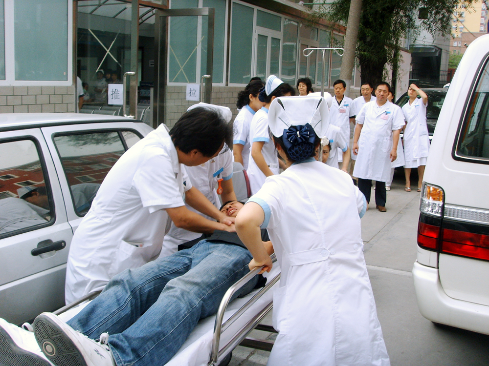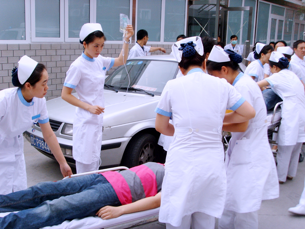 2008年7月18日上午9点,北京中医药大学第三附属医院进行了一次突发公共卫生事件群体伤应急实战演练。9点整,医疗处模拟接到奥运会中心场馆区打来的电话,告知将有6名群发伤伤员立即送到我院。我院立即启动应急预案,保卫组、医疗组、护理组、联络组四组人员及指挥部其他成员接到通知后立即到达现场。9点10分,第1辆救护车驶入医院,共有4名伤员,一名为昏迷、一名为腹部踩踏伤、一名为头皮裂伤、一名为心慌胸闷待查。9点20分,第2辆救护车驶入医院,共有2名伤员,一名为左股骨干骨折,一名右肩关节脱位兼颌面外伤。两批伤员经过外科检伤分类员快速检伤分类,很快被转送至急诊科救治。医疗组组长根据病情,通知外科、骨科、内科多名医生负责相应的伤员,护理组也按照预案从各科抽调护士来急诊支援;责任医生根据伤情决定相应的辅助检查及是否需要手术;根据病情,生命支持组、专家组成员接到通知后迅速赶到现场,整个抢救过程紧张而有秩序进行。