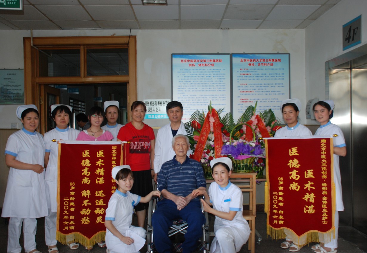 目前,我已经病愈出院了,一个年近百岁的老人,从躺着被别人推进医院,到自己走出医院的大门,北中医三附院医德和精湛的医术,创造了这一奇迹。在此,我对贵医院的领导,和骨伤科的各位医护人员,表示衷心的感谢!谢谢你们!