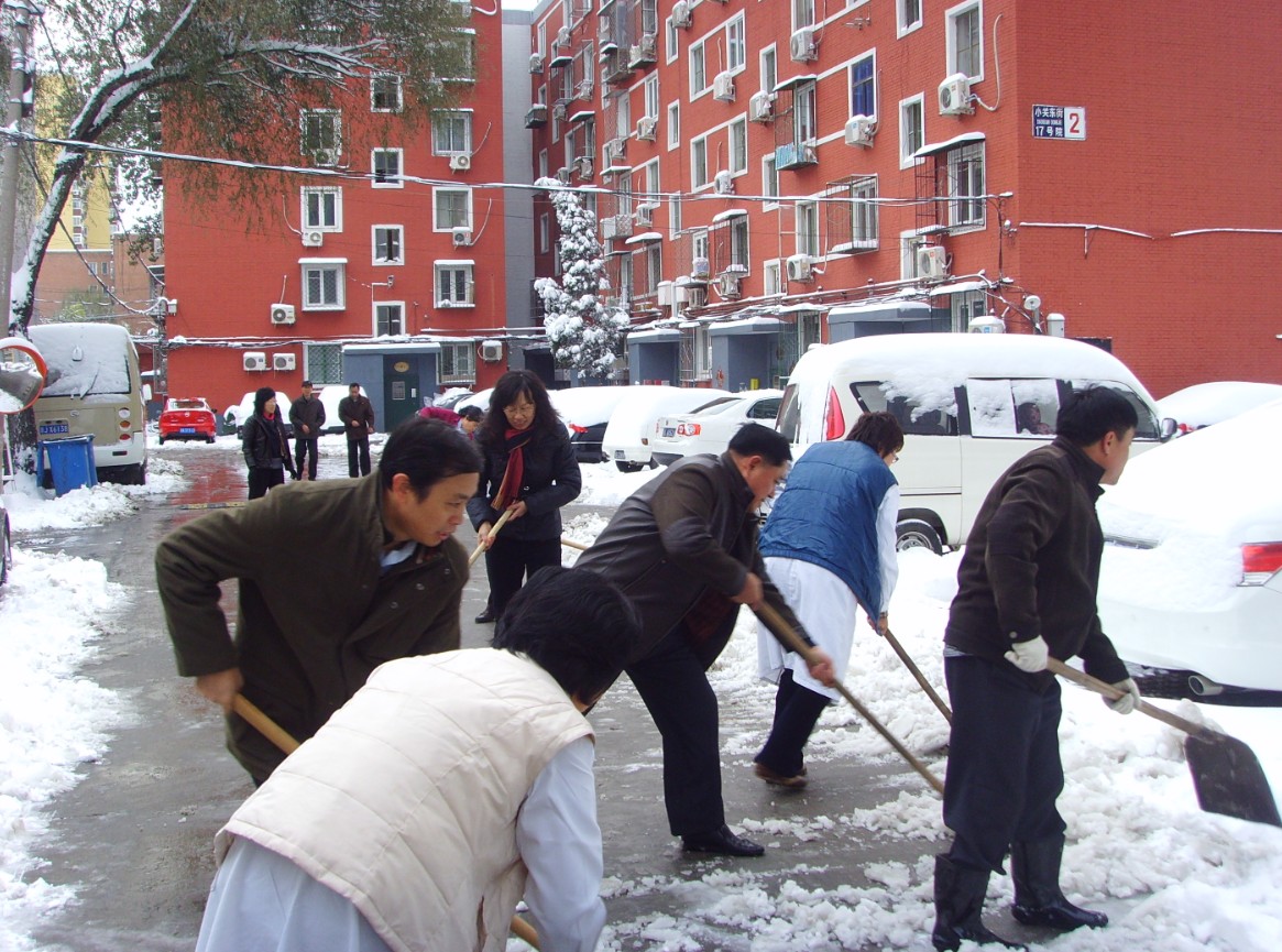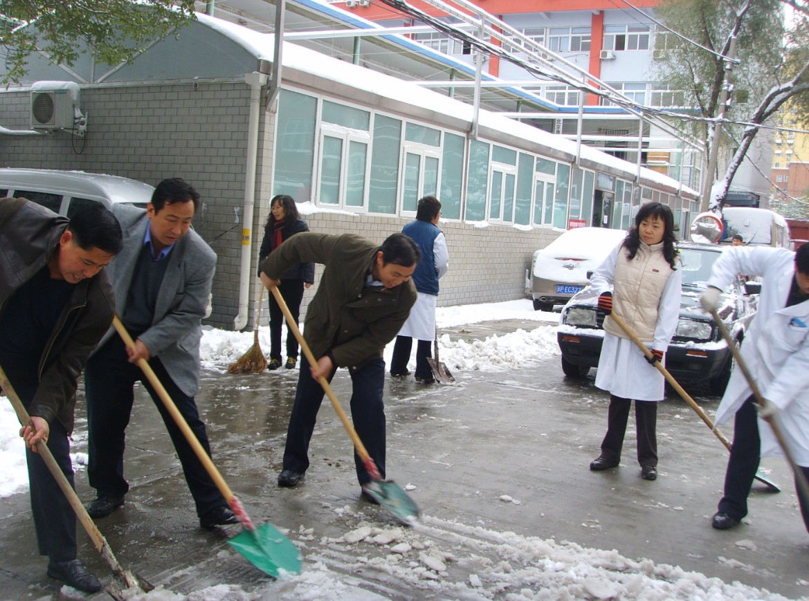 早晨6时许,收发室的值班人员及几位保安、保卫科的同志就开始在医院大门口扫雪了。7时左右,后勤处各科室的职工们陆续上班,看到医院门口及路面的积雪很厚并开始结冰,已经严重影响病人进出安全,大家在杨书记的带领下自发来到室外扫雪。后勤处立即搜集了部分铁铲、铁锹和扫帚供大家使用。不到一小时就将院内的通道清理了出来,保证了患者的就医方便和安全。