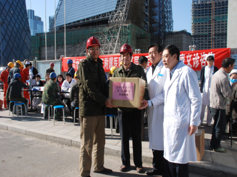 党委书记杨晋翔、副院长王庆甫代表第三附属医院为央视文化中心复建工地的工人免费捐赠了千元以上的预防流感等常用药品,专家们还并针对建筑施工作业和冬季预防易发疾病向工人进行宣传和咨询。此次义诊共为300多名工人进行了健康检查和健康咨询,发放中医健康科普宣传材料1000多份。