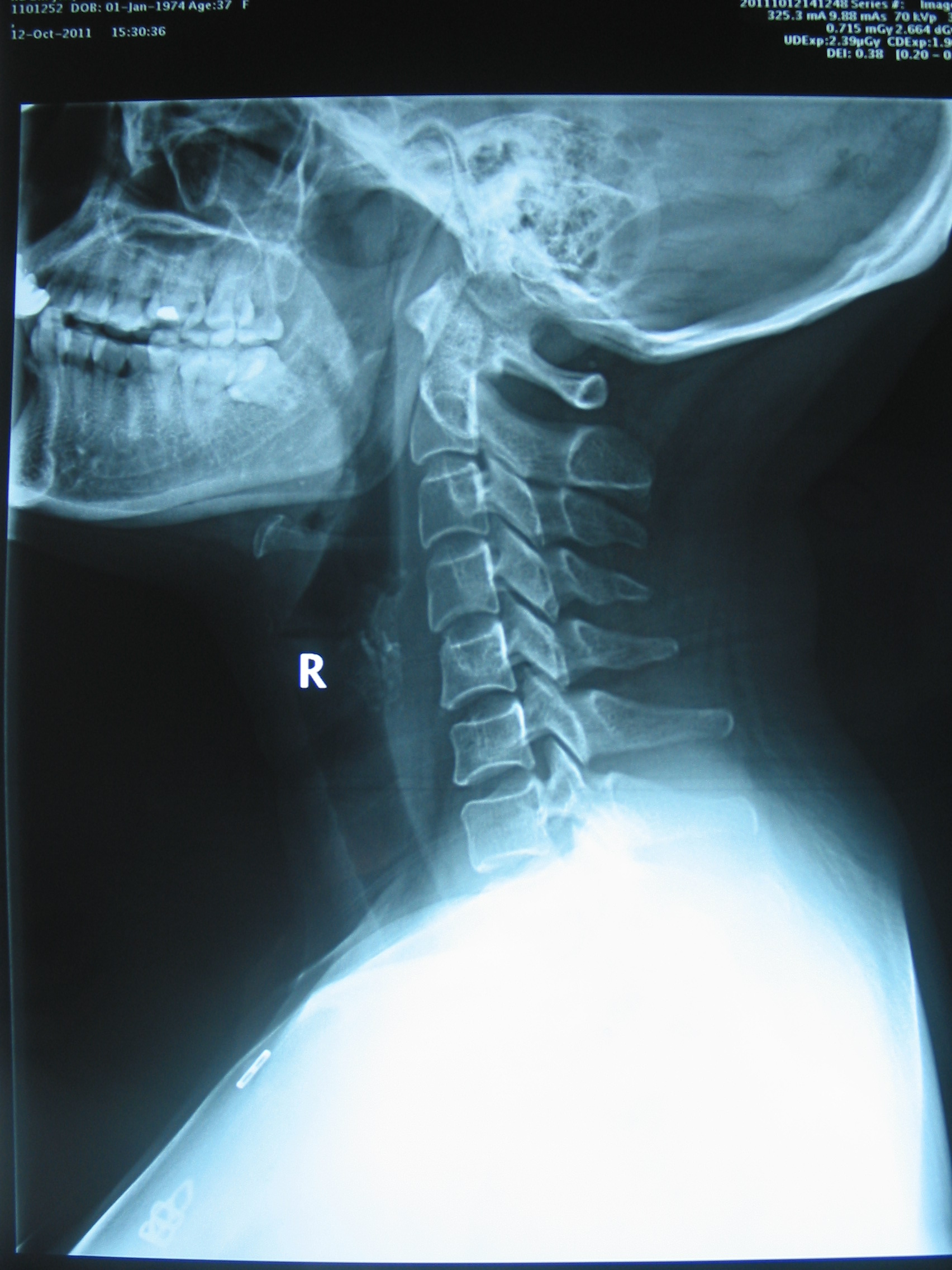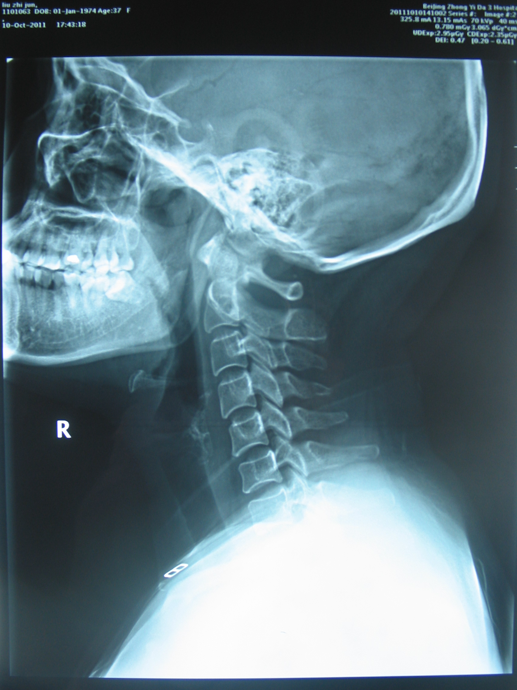 患者,女性,37岁,诉晚间卧床看电视过久,次日清晨头晕、恶心严重,遂至我院急诊就诊。予扩张血管、止吐等药物对症治疗,无明显疗效。查颈椎X线片,请我科门诊会诊。阅片:颈椎曲度异常,可见颈椎小关节紊乱征象(图X线片1,2, 颈椎正侧位治疗前(左侧))。予颈椎不定点旋转手法复位治疗,头晕恶心立即大部分缓解。隔日门诊复查仅残留偶发眩晕症状,复用旋转手法治疗,症状完全消失,复查X线,颈椎小关节紊乱已至正常(图X线片1,2,颈椎正侧位治疗后(右侧)),随访1月未见复发。