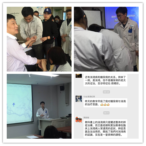 消渴病是现代多发病,王磊老师深入浅出的阐述了现代社会消渴病不同于古人的发病特点。尤其对病因病机的讲解,结合实际生活,精彩举例,形象生动,但又发人深省,扩大了大家的视野,使对同学们对消渴病的发生发展有了更深入的理解。消渴病不同阶段有不同的脉证,王磊老师教给同学们从细微处体察舌脉特点,洞察根本。期间对生活中广泛存在的口干症状进行了专题讲解,以《黄帝内经》"饮入于胃,游溢精气,上输于脾,脾气散精,上归于肺,通调水道,下输膀胱,水精四布,五经并行。合于四时五脏阴阳,揆度以为长也。"为基本依据,结合《脾胃论》、《医学衷中参西录》等医家学术思想,提出不同人群有不同特征,治疗口干,不能见干就滋阴,调整气机为根本要务,解除气机阻滞的原因是治疗大法。使同学们对口干的治疗豁然开朗。