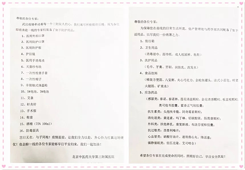 1月26日,初二,晚上18:07,专家组物资准备基本就绪,常备药品、防护器具、生活用品......共计11箱,各类物资57种。为了方便专家使用,同时给大家加油打气,郭玮老师还特意在每一个行李箱中,都留下了两张“温馨提示”。资产管理处为专家支援队准备的这些吃穿住行必备品和增强抵抗力的药物塞满了行囊,塞满了全院对他们的信任与希望、担忧与期盼。