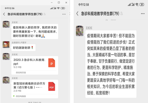 第二,此次线上培训学生按必转科室、补转科室及选转科室入群。选转学生的数量,在一定程度上是科室教学质量的反映。有的科室群学生数已经到了80人,选转的人数非常多。这在原来的模式中是不可能实现的。很多主任亲自开坛授课,同学们踊跃提问,线上气氛非常活跃,效果非常好。