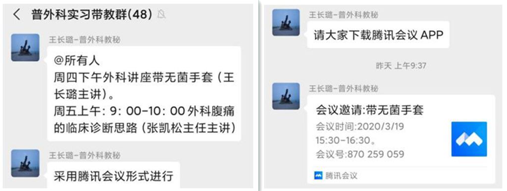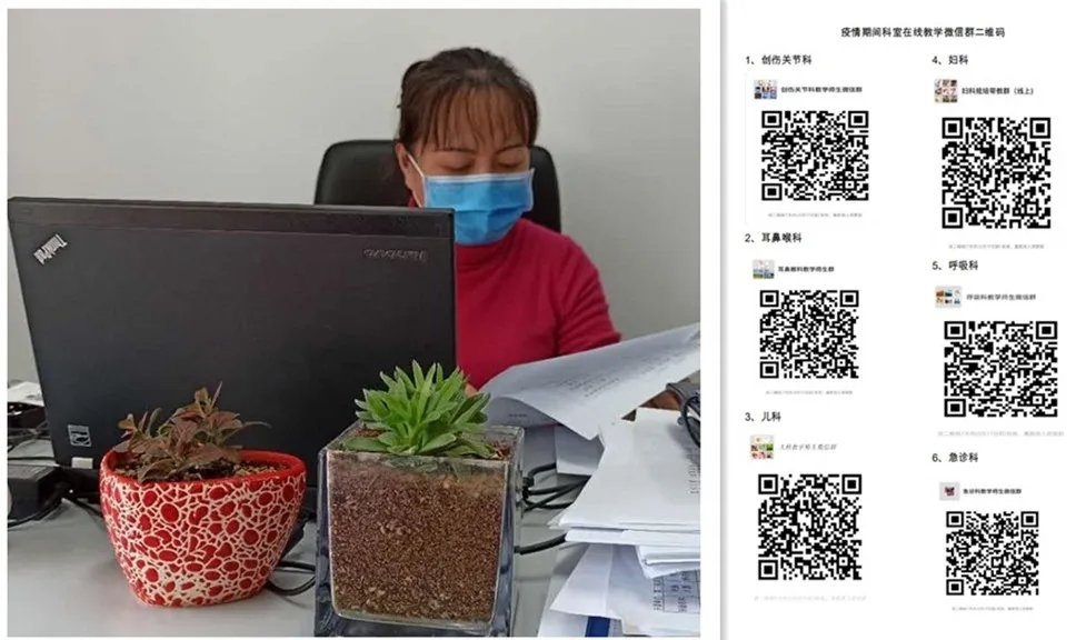 教育处制定了《关于2020年延期开学期间临床实践教学工作的方案》,3月10日闫英副院长亲自召开视频会进行部署。要求各临床科室组建各科室教学微信群,综合本科生、规培学员(含并轨专硕)、研究生的培养方案与考核要求制定在线教学周计划,利用腾讯会议、微信、钉钉等平台,开展线上实践教学。要求科室主任全面负责,开展教学质量督导。科室秘书建好微信群后,由教育处将通知和群二维码统一下发给学生,督促学生进群学习。全体师生积极调整状态,投入了极大的热情,充分利用各种信息技术手段,于3月16日正式开展了临床实践教学“线上轮转”。