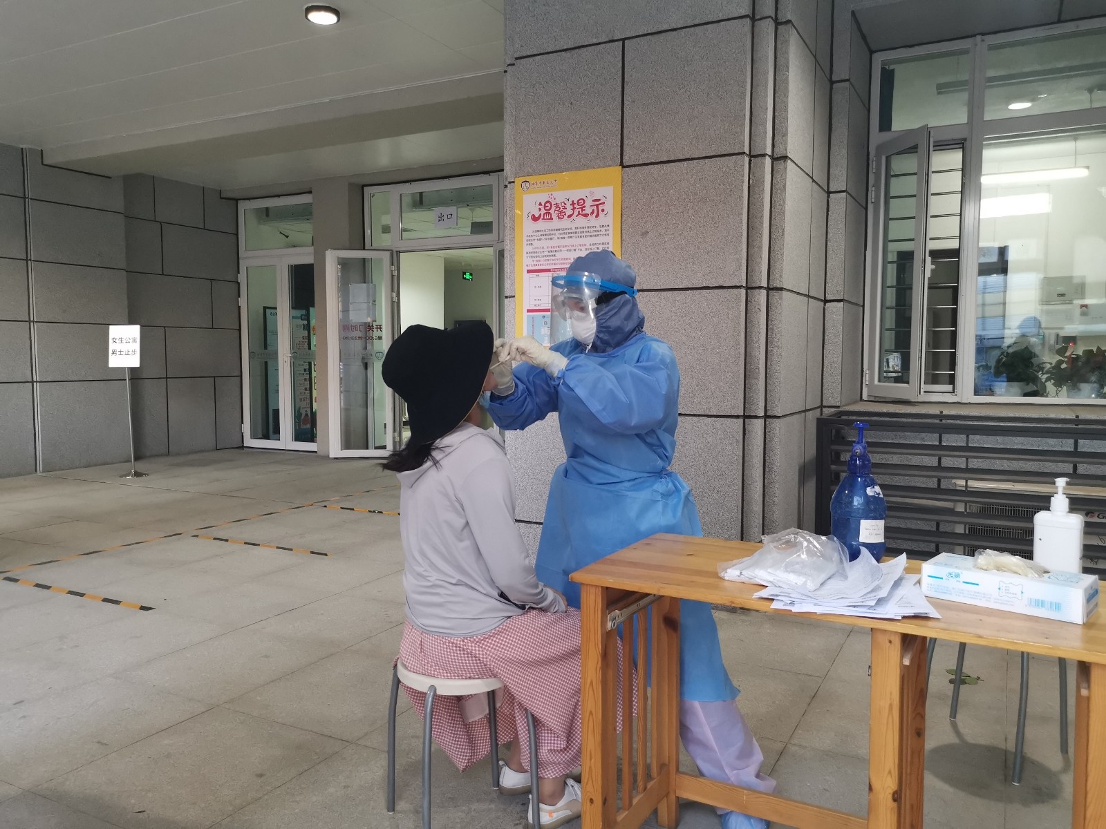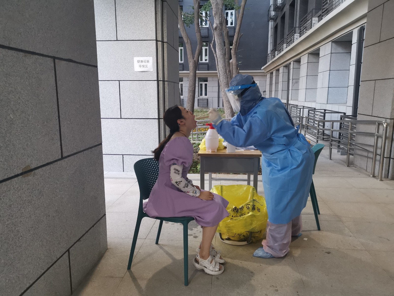 6月13日,护理部接到大学紧急通知,对望京校区、和平街校区的返校学生进行咽拭子采样。接到任务的第一时间,护理部立刻抽调工作人员,协调脑病科李春峰护士长、妇科杜敏杰护士长、良乡校区刘阳阳护士长,急诊护士赵紫彤、李悦、明月,脑病科护士高倩等护理工作者积极应对突发任务。13日上午杜敏杰护士长与急诊赵梓彤护士到望京校区为返校学生采集咽拭,顺利完成第一波任务。14日当天在35度的高温下,为在校师生、后勤服务人员采集咽拭子。14日下午4点接到大学紧急通知为大学师生采集咽拭子,她们6点迅速到位,分别在良乡和和平街校区进行连夜采样。为保证结果及时反馈,连夜将标本全程护送至监测公司。她们不辞辛苦加班加点,完成任务后双手都已经泡涨、防护服下的衣衫已被汗水完全浸透。