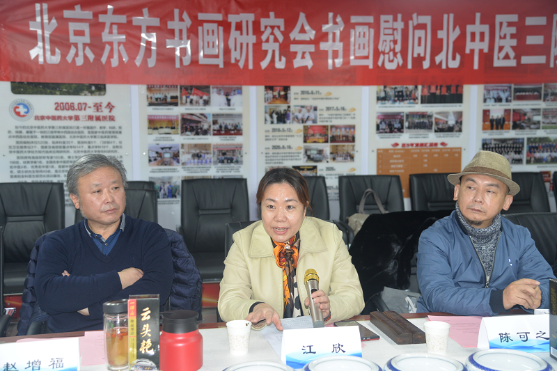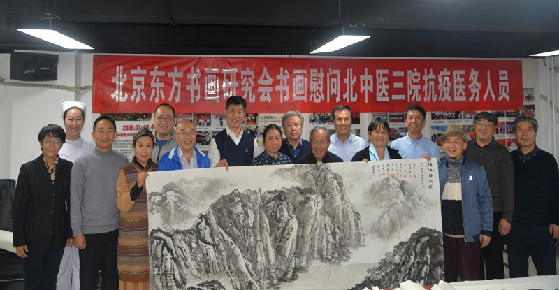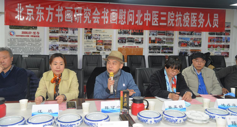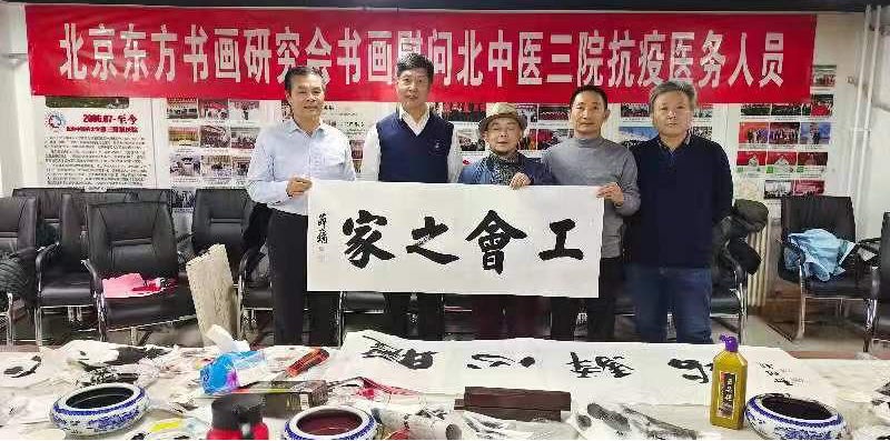 为进一步传承弘扬中国优秀传统文化,活跃医院政治文化生活,营造健康和谐的文化氛围。12月10日,农工党北京中医药大学第三附属医院支部邀请农工党北京市委所属北京东方书画研究会,举办了学习中共十九届六中全会精神座谈会暨慰问抗疫一线医务人员书画笔会。书画笔会特别邀请了市委会秘书长江欣,市委常委、北京东方书画研究会会长陈可之,副会长赵增福、农工党北京市委社会服务处处长张亚娟等领导和北京东方书画研究会10余位艺术家。北京中医药大学附属第三医院院长王成祥,副院长徐峰、刘子旺、闫英、白鹏、徐佳、陈卫衡,工会主席郭兆党参加了此次活动。座谈会由北中医三院纪委书记兼党委副书记王国华主持。
