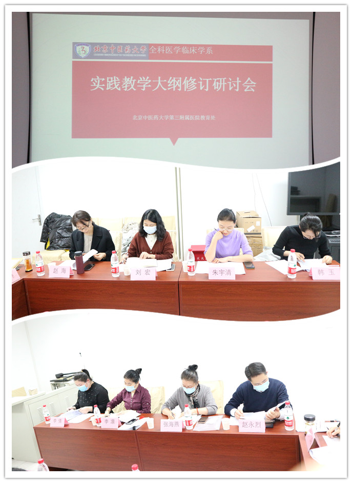 2021年12月22日下午,第三临床医学院教育处联合北京中医药大学全科医学临床学系召开《社区医学实践》实践课程教学大纲制定第二次专家研讨会。北京中医药大学第三附属医院教学副院长闫英教授,北京中医药大学第三附属医院副院长、全科医学临床学系主任徐峰教授,双榆树社区卫生服务中心赵海主任,蒲黄榆社区卫生服务中心刘宏主任,中日友好医院国际部全科医疗朱宇清主任,小关社区卫生服务中心副主任、全科医学临床学系委员张海燕,学系秘书李倩,教育处处长赵永烈教授,小关社区卫生服务中心李凛副主任,岐黄学院教办韩玉老师参加了本次研讨会。