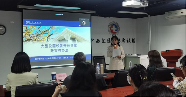 石磊科长为大家讲解了《开放共享仪器设备预约使用办法》。她从平台简介、仪器展示、操作流程、注意事项等方面为大家介绍了大学科研仪器种类及使用情况,着重讲解了“北京中医药大学共享技术服务平台”的操作流程。