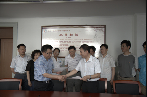 2015年6月3日,新华网络电视台健康频道祝泉龙总监一行前来我院座谈,我院刘金民院长、王庆甫副院长、王国华副院长、人事处李平处长、教育处赵永烈处长、科研处李小黎处长、社会工作部江涛主任及党办乔克老师、教育处张进宏老师等领导陪同并致欢迎辞,气氛融洽,双方签署了宣传战略合作备忘录。